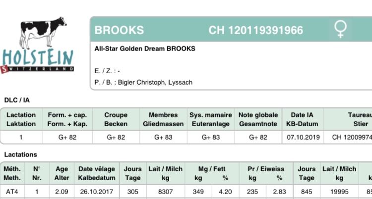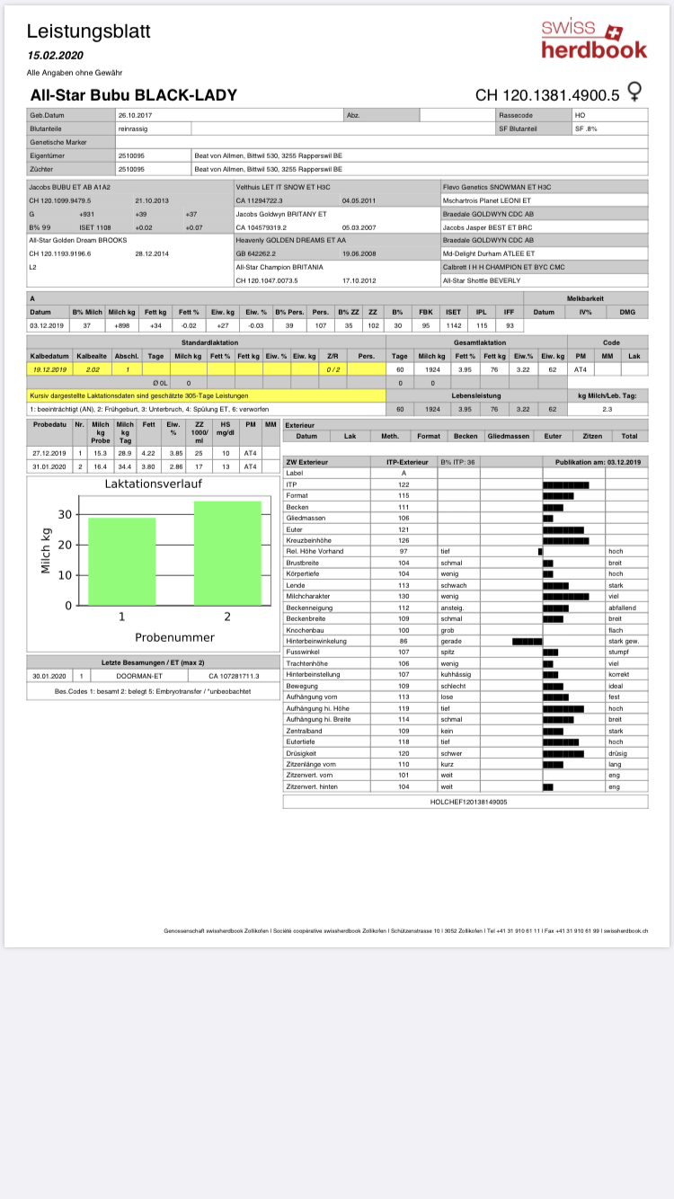 Wir verkaufen die frisch gekalbte All-Star Bubu Black-Lady. Sie besticht durch ihren extrem ausbalancierten Körper und dem tollen Euter. Sie produziert viel Milch mit tiefer Zellzahl 17 und guten Inhaltsstoffen. Sie ist bereits wieder mit Doorman besamt. Nous offrons maintenant une jeune vache fraîche vêlée: All-Star Bubu Black-Lady.Elle séduit par sa morphologie superbe et harmonieuse et son pis magnifique. Elle produit beaucoup de bon lait avec un taux de cellules bas (17) et de bonnes teneurs. Elle est à nouveau inséminée avec DOORMAN.