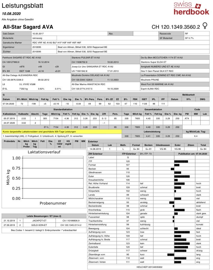 Junge tolle RF-Kuh frisch in der zweiten Laktation. Erste Laktation 7100 kg Milch mit 4.36 F und 3.26 E. Super Persistenz. Schalmtest i.O. LBE 84/81/85/86 G+84 Das Eutersystem wurde mit VG 86 eingestuft!! Eine Kuh mit Zukunft! Jeune grande vache RF fraîche dans sa deuxième lactation. Première lactation 7100 kg de lait avec 4,36 mg et 3,26 p. Grande persistance. Test de Shalm OK. DLE 84/81/85/86 G + 84 Le pis a été classé VG 86 !! Une vache avec de l' avenir!