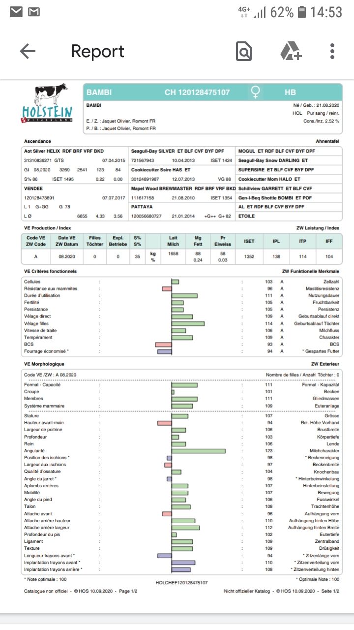 Belle vachette avec 1352 ISET. Helix/brewmaster la mère a fait 6855kg avec 4.33% 3.56% la vachette est en pleine forme. Schönes kuhkalb Helix/brewmaster die mutter hat in der erste laktation 6855kg 4.33% 3.56% das kalb ist in top form