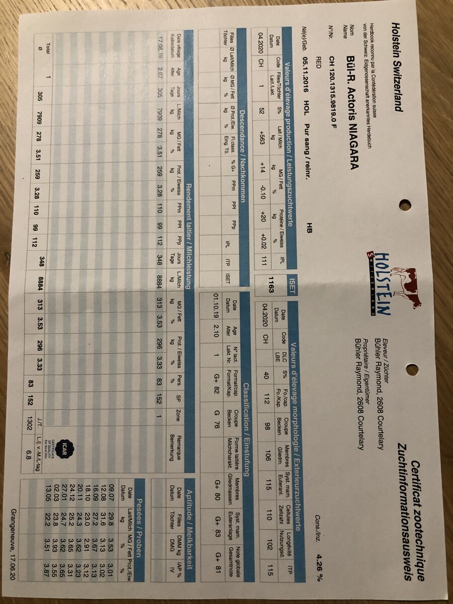 Bonne vache rouge 44 kg de lait avec 12 cellules au dernier contrôle; issue d une famille très laitière 1L G+ 81 (83sm) x VG 89 x 1L G+ 81 x VG 89 x EX 91 Ptit Coeur Rado MARTINA. Sa mère est une Ladd qui a Produit 11’951 kg en 4 ème lactation. Gute RH-Kuh, die 44 Kg, ZZ 12 am letzen Kontrolle, Tagesmilch produziert, aus einer Familie wo die Kühe viel Milch produzieren. So klingt das Pedigree: G+81 (83 Eutersystem) in 1. Lakt x VG89 x 1L G+81 x VG 89 x EX 91 Ptit Coeur Rado MARTINA. Die Mutter ist eine Tochter von LADD die 11’951 kg in 4. Laktation produzierte.