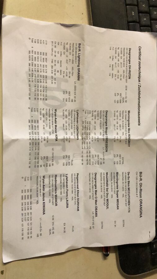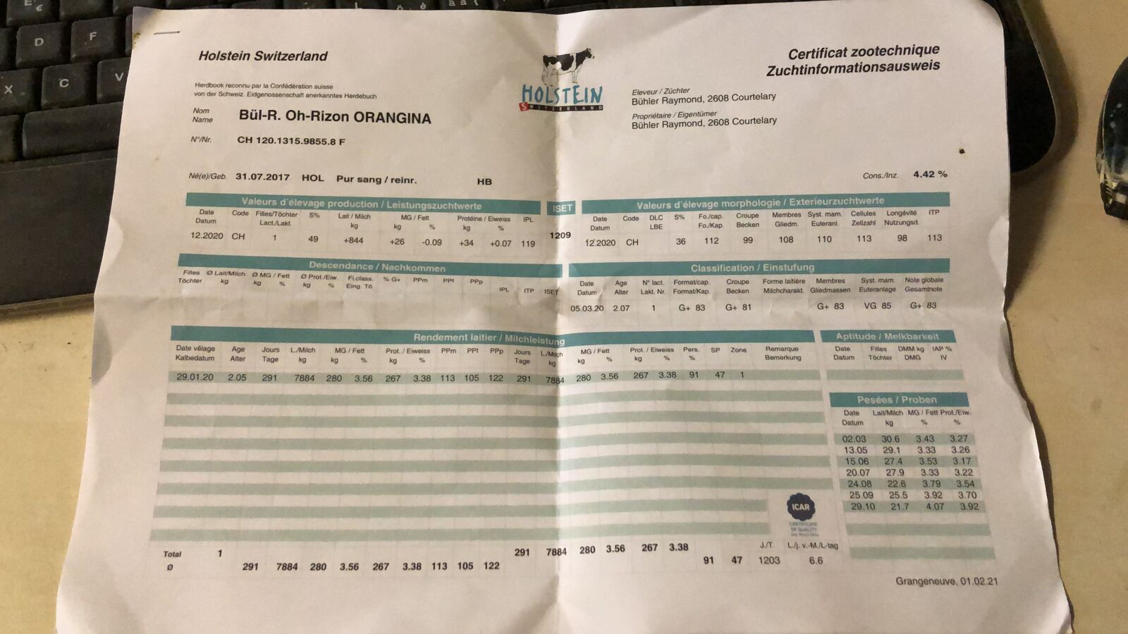 Bonne vache en 2 ème lactation , laitière, 40 kg garantie et 8 ‘ cellules , bonne morphologie G+ 83 1L avec VG 85 en système mammaire , sa mère EX 91 2E a produit 60’000 kg en 6 lactations. Gute junge Kuh am Anfang ihrer 2.Lakt.; produziert viel Milch, 40 TM garantiert und ZZ 8. Sie hat eine gute Morphologie: G+83 in 1.L mit VG85 im Eutersystem; ihr Mutter ist EX91 2E und produzierte 60'000 Kg in 6 Laktationen.