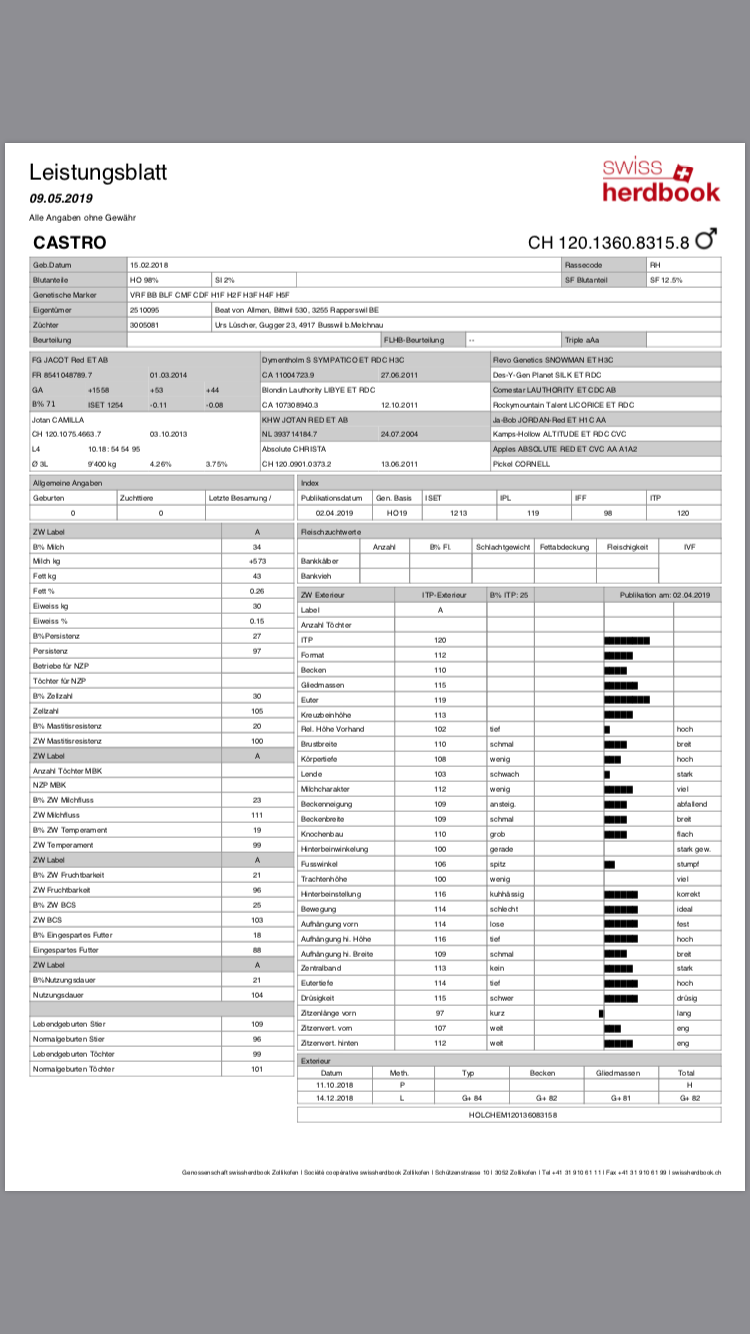 Weidegewohnter, exterieurstarker RH Stier LBE G+82. Gute Fruchtbarkeit, Halfter gewohnt. Moderne, interessante Abstammung Jacot x Jotan x Absolute. Jeune taureau RH noté G+82. Il est habitué au licol et à la pâture. Sa fertilité est bonne. Son ascendance est attractive et moderne: JACOT x JOTAN x ABSOLUTE.