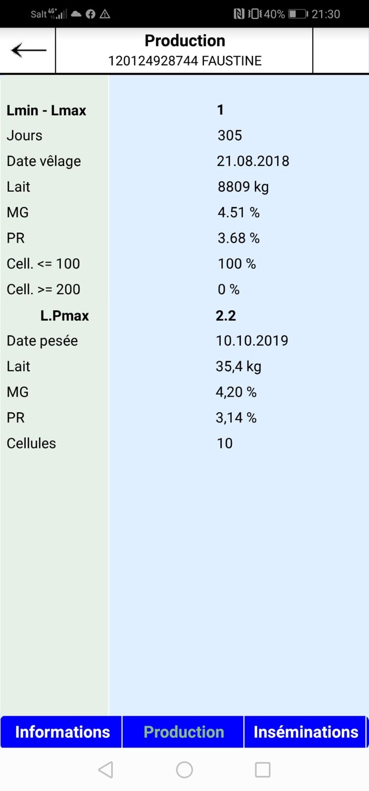 Jolie vache fraîche en 2ème lactation. Inséminée le 22.10.2019 avec une dose sexée de DOPPLER !! Elle a un très bon pis et de bons aplombs, une bonne persistance laitière également ! En 1 ère lactation elle a obtenu VG 85 (86 au SM). Dernier contrôle: 10 aux cellules ! Hübsche HO-Kuh am Anfang der 2.Laktation. Wurde am 22.10.19 mit sexierte Dosis von DOPPLER besamt. Sie hat ein sehr schönes Euter und gute Beine, eine gute Milchpersistenz auch. Als 1.Lakt. wurde sie VG 85 (VG 86 Eutersystem) !!! Letze Kontrolle: ZZ 10