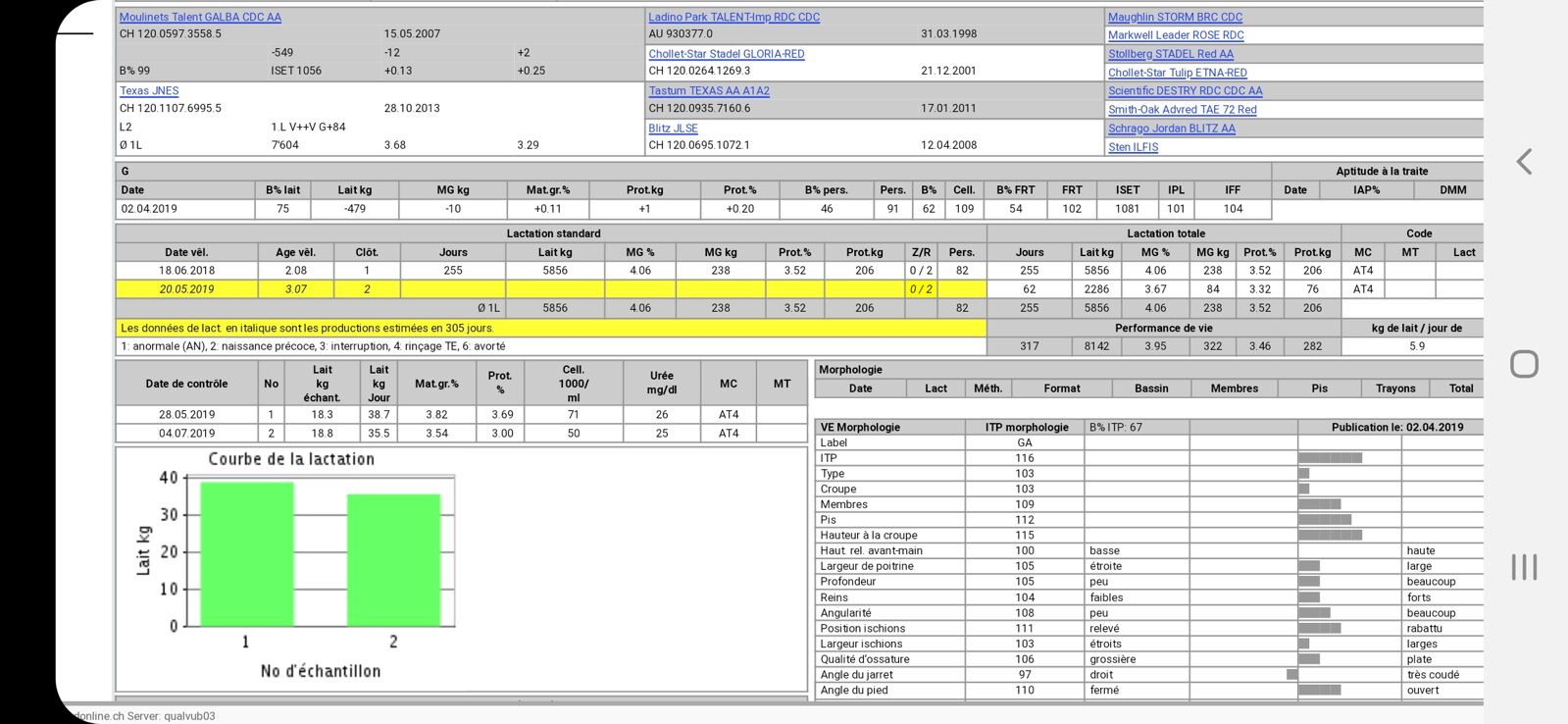 Superbe jeune vache du deuxième veau, très bon pis et très bons membres ! Elle aura 4 ans au mois d'octobre! Elle a déjà participé à la SWISS RED NIGHT en 2018. Elle saura vous satisfaire par sa persistance laitière et sa superbe fécondité: porte toujours a la première insémination (voir papier) Pas de cellules, vache très calme, et très bon début de production au 1er veau avec une lactation projetée à 305 jours de 7000 kg de lait (pas indiqué sur papier). Sa mère a été classifiée 84G+ au 1er veau avec 85VG en système mammaire (85/82/82/85)! Cette vache saura très bien s'intégrer dans votre troupeau! Sehr hübsche junge Kuh im 2. Lakt, mit sehr gutem Eutersystem und sehr guten Beinen ! Sie wird erst 4 Jahre alt nächstem Oktober sein ! Sie hat schon an SWISS RED NIGHT in 2018 teilgenommen. Sie lässt keine Wünsche offen mit ihr Milchpersistenz und guter Fruchtbarkeit : sie trägt immer mit der ersten Besamung (siehe Papier). Sehr niedriger ZZ, sehr ruhige Kuh, und sehr guter Produktion im erster Lakt : projektiert an 305 Tagen mit 7000 kg (nicht erwähnt auf dem Papier). Ihre Mutter wurde G+84 im erster Lakt. mit einem VG85 im Eutersystem (85/82/82/85) ! Diese Kuh wird sich ohne Probleme ihre neue Erde integrieren.