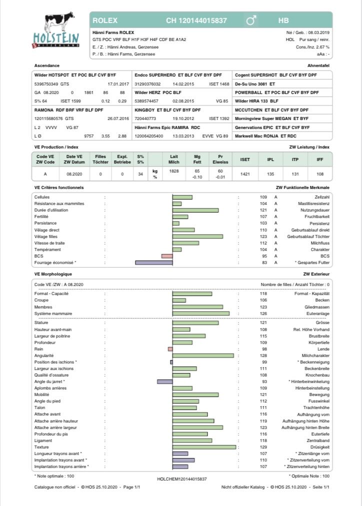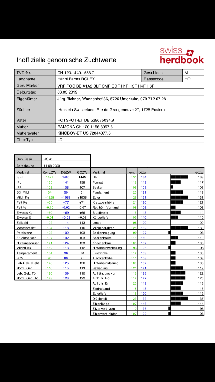 Genetisch Hornloser Zuchstier aus der Familie von Markwell Blackstar RAVEN EX95 mit Top Genom. Springt sehr gut,und hat einen super Charakter. Früher Hotspot Sohn. Seine Mutter ist Hänni Farms Kingboy RAMONA 1.Laktation 9757kg und wurde kürzlich in der 2.Laktation mit VG87 EU88 beschrieben. Seine Grossmutter ist eine Epic Tochter VG89 EU90. Taureau reproducteur génétiquement sans corne de la famille Markwell Blackstar RAVEN EX95 avec génome de premier ordre. Saute très bien et a un bon caractère. L'un des premiers fils de HOTSPOT. Sa mère est Hänni Farms Kingboy RAMONA 1ère lactation 9757kg et qui a été récemment décrite en 2ème lactation avec VG87 EU88. Sa grand-mère est une fille d'Epic VG89 EU90.