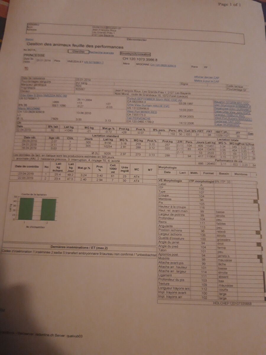 Bonne vache fraîche du 3 ème veau avec beaucoup de lait et bonne persistance,bonne aptitude à la traite 47.5 kg par jour; 7 aux cellules. Provenant d'une exploitation de fabrication de Gruyère en zone de montagne 2 pâture intégrale du printemps à l automne. Sa lignée maternelle vante un croisement recherché de RUBENS x FABER. Gute Kuh am Anfang ihrer 3. Lakt. Viele Milch, gute Produktionsausdauer, und gute Melkbarkeit. Sie produziert 47,5 Kg Tagesmilch mit ZZ 7. Kommt aus einem Betrieb mit Käseproduktion im Berggebiet II (ganzes Jahr vom Frühling bis Herbst in der Weide). Ihre Mutterlinie stammt aus ein gesuchte RUBENS x FABER Crossing.