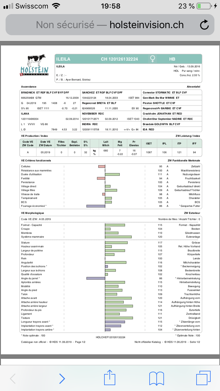 Superbe jeune vache fille du taureau BRADNICK, garantie portante. Cellules 58, traite idéale. Elle-même avait porté du premier coup. Elle a assez de bon lait, avec de bonnes teneurs. Il s'agit d'une primipare qui fera le bonheur d'un connaisseur. Mère vg86 premier veau. Grand-mère g+84 premier veau. Ileila est une vache très calme. Super schöne junge Kuh aus BRADNICK. Garantiert trächtig. ZZ 58 und ideale Melkbarkeit. Mutter ist VG 86 im erster Lakt. notiert. Und Grossmutter G+84 im erster Lakt. Ileila ist eine ruhige einfache Kuh. Sie wurde trächtig mit erster Besamung, und produziert Milch genug mit guten Gehalten. Hier steht wirklich ein Erstmelk mit Zukunft, das viel Glück zu einen Kenner bringen wird !