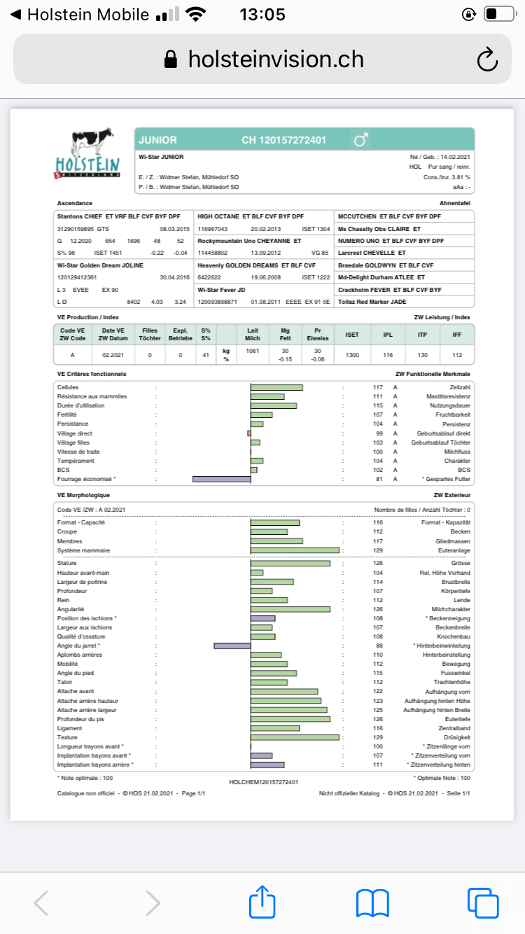 Schönes Stierkalb (V. Chief) aus einer guten Mutterlinie mit 3 Generationen EX-Einstufungen. Mutter (Bild 3 und 4): EX 90 (V. Goldendreams) mit sehr guter Fruchtbarkeit; Grossmutter (Bild 5): EX 91 5E (V. Fever), 85‘000kg Lebensleistung und bei guter Gesundheit; Urgrossmutter: EX 91 2E (V. Red Marker). Beau taurillon (V. Chief) issu d'une bonne lignée maternelle avec 3 générations de classifications EX. Mère (photos 3 et 4): EX 90 (V. Goldendreams) avec une très bonne fertilité; Grand-mère (photo 5): EX 91 5E (V. Fever), 85 000 kg de production à vie et en bonne santé; Arrière grand-mère: EX 91 2E (V. Red Marker).
