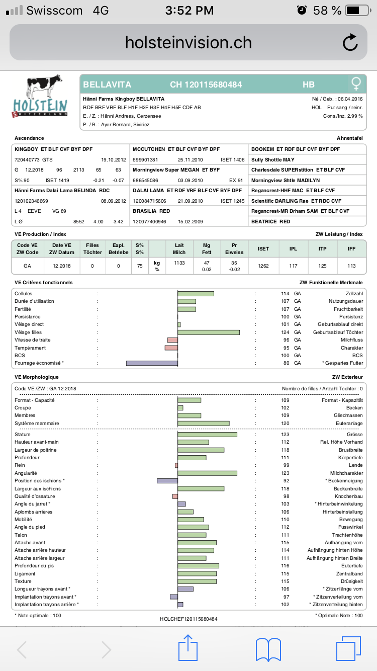 Superbe primipare du taureau Kingboy. Beaucoup de format, très profonde avec un très bon dessus. C’est une jeune vache avec un très bon système mammaire vg85. Elle a une note global de g+84 (pénalisée au format car déjà trop grande pour une primipare) Elle a fait 4 ieme à la junior bulle expo 2017 et 6 ième à Swiss Expo 2018 C’est une vache pleine d’avenir avec beaucoup de lait. Aus KINGBOY, dieses gekalbtes Rind gehört der Extraklasse. Sehr starkes Format, sehr tief, mit gutem Rücken (obere Linie). Diese Kuh hat ein sehr guten Eutersystem VG 85. Gesammt Note G+84 im erster Lakt. (Format hat negativ der Noten beinflusst, weil die Kuh ist gross für eine erste Lakt.). Wurde 4. Am JUNIOR BULLE EXPO 2017 und 6. Am SWISS EXPO 2018. Hier steht an dieser Auktion eine Kuh mit vieler Zukunft, und viele Milch.