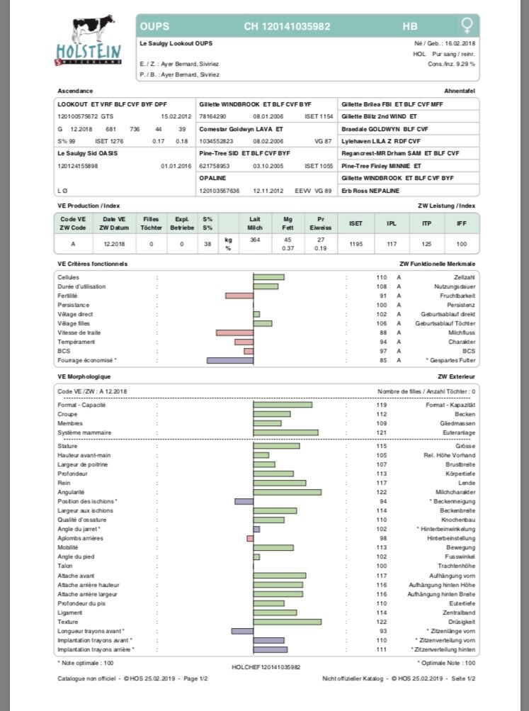 Belle génisse du taureau Lookout avec bonne façon de tétine. Mère et grand-mère et arrière grand-mère avec beaucoup de teneurs. Sa grand-mère Opaline a participé à plusieurs expos en temp que génisse et vache, elle est classifié vg89 en 3 ième lactation. Famille de vaches très complètes. Hübsches Rind aus LOOKOUT mit schönen Zitzenplatzierung, und Anfangseutersystem. Mutter, Grossmutter und Urgrossmutter haben viel Gehalten. Grossmutter OPALINE hatte an mehreren EXPO als Rind und junge Kuh teilgenommen. Sie wurde VG 89 in dritten Lakt. Familie aus sehr kompletten Kühen.