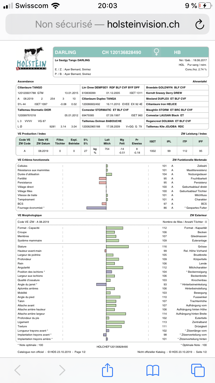Belle primipare vêlée d’une dizaine de jours première pesée à 7 jours 24,6kg de lait avec 25 cellules. Hübsches und sehr frischgekalbtes Erstmelk. Produzierte schon 24,6 Kg-Tagesmilch 7 Tagen nach dem kalben, mit ZZ 25