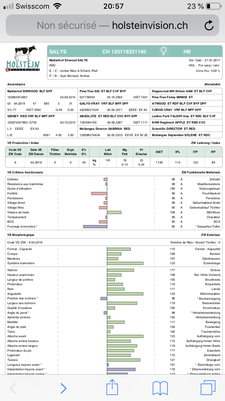 Superbe primipare provenant d’une famille incroyable, du côté paternel (Galys-Vray) et du côté maternel : Mattenhof Absolute Sydney ex93 Mollanges Director Sabrina ex93 2E Mollanges September Solene ex94 4E Castelverde Stardust Sayonara ex90 Castelverde Chief Mark Suzy ex97 Castelverde Starbuck Pansy ex90 Salys a vraiment un bon développement, de superbes pattes et un très bon pis. Une chance inouïe de rentrer dans cette superbe famille avec une jeune primipare vêlée en pleine forme. Herrvoragende Gelegenheit in einer fantastischen Familien mit so einem gekalbten Rind mit super Euter einzutreten. Dieses gekalbtes Rind kommt aus einer unglaublichen Familien, als Vater-Abstammung: (Galys-Vray) und als mutterliche Abstammung : Mattenhof Absolute Sydney ex93 Mollanges Director Sabrina ex93 2E Mollanges September Solene ex94 4E Castelverde Stardust Sayonara ex90 Castelverde Chief Mark Suzy ex97 Castelverde Starbuck Pansy ex90 SALYS ist sehr gut entwickelt, hat super Beine und ein sehr gutes Euter.