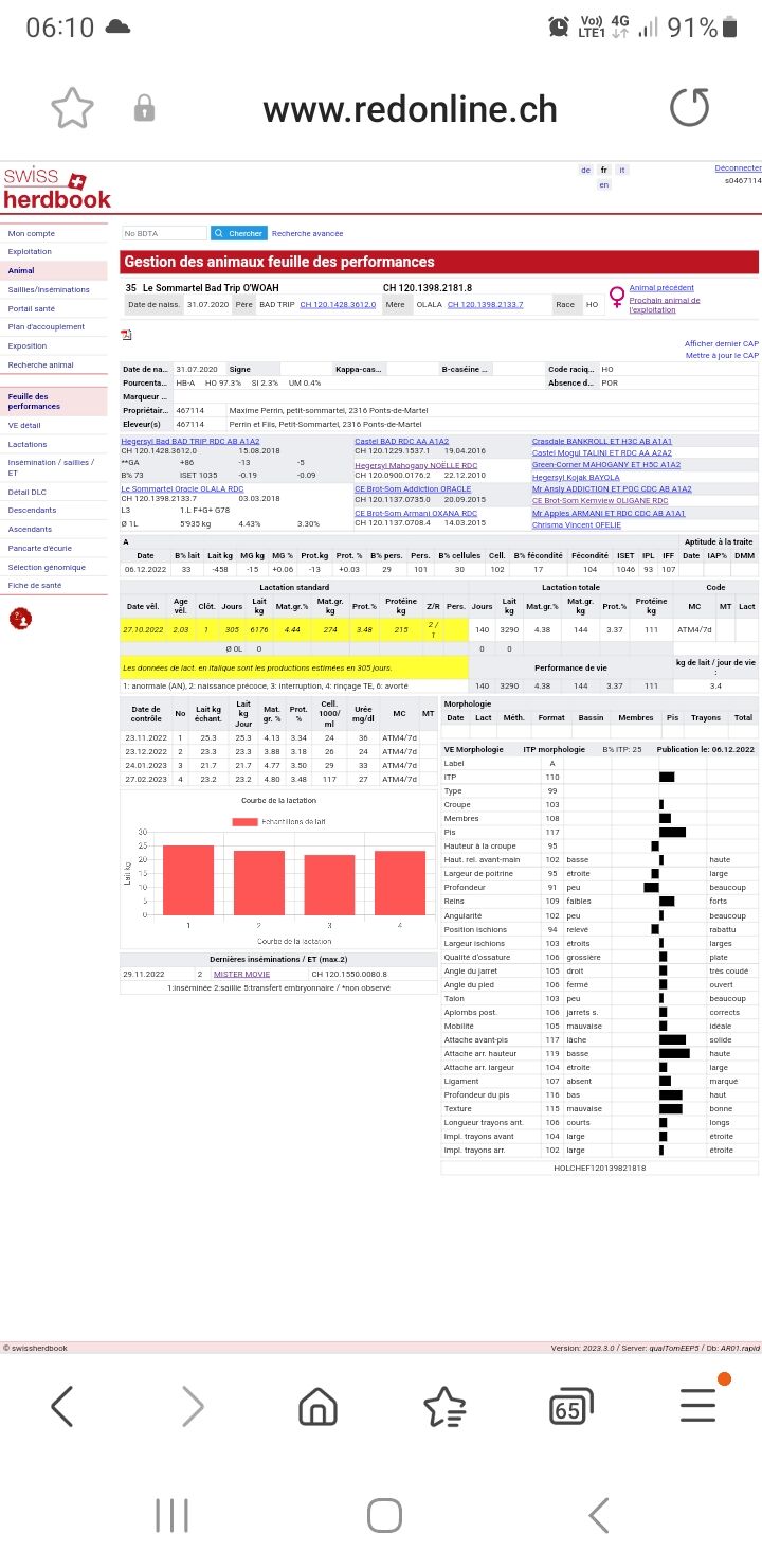 Gute Kuh in ihrer ersten Laktation, wieder trächtig für den 5. September mit 23kg Milch pro Tag mit 4.80 Fett und 3.48 Protein und ZZ 117.