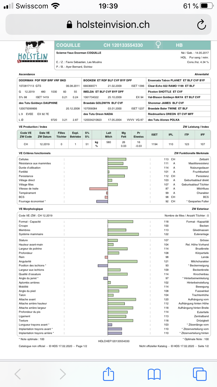 Superbe jeune vache du fameux taureau Doorman. Coquille est rapide à traire. Elle est gestante de High Octane pour le 03.03.2020, elle est donc maintenant en phase de tarissement. Derrière elle, une superbe "Goldwyn" ex92 7E. Sehr schöne junge Kuh aus dem DOORMAN. COQUILLE geht schnell zu melken. Sie ist hochträchtig von HIGH OCTANE für den 3 März 2020. Sie ist jetzt galt. Im direktem Abstammung steht eine super Kuh EX 92 7E aus GOLDWYN