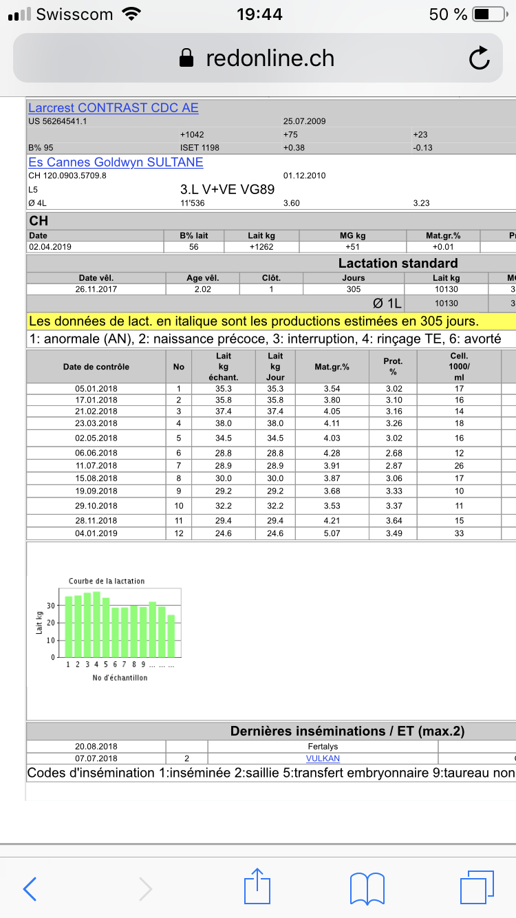 Belle vache prête pour son deuxième veau. Gentille et habitué à l’attache et à la stabulation. Elle a produit 10’130kg de lait en première lactation. Jamais eu plus de 33 cellules. Sa mère est une Goldwyn vg89 au global avec ex91 au pis en troisième lactation, sa grand-mère une Glen également vg89 et ex93 au pis. Selfie est portante pour le 7 avril. Hübsche junge Kuh, die hochträchtig von ihrem 2. Kalb ist (7.4.) Ruhig und Anbinde-, wie Lauf-stall gewohnt, sie produzierte 10'130 Kg im 1. Lakt. Hatte niemals mehr als 33 ZZ. Mutter VG 89 mit EX 91 im Euter in der 3. Lakt. Grossmutter auch VG 89 und EX 93 im Euter.