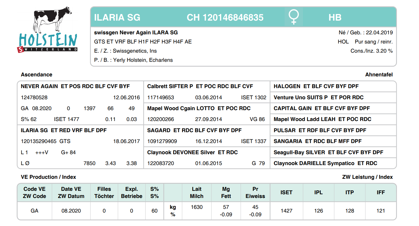 Sa mère, Claynook Sagard ILARIA SG (photos 3+4) est fraîche vêlée et elle se présente au top ! Elle participa à la Swiss Expo 2020 et pris le 3e rang lors de la Gruyère Expo 2020. Swissgen ILARA (photo 1+2) est issue de la famille de la très célèbre Ocd Planet DIAMOND EX-92 3E (Photo 6), qui a chez Claynook une multitude de ses filles classifiées Excellentes ! OCD Planet DIAMOND est aussi la vache souche en arrière de Claynook BAROLO SG et CANON SG. ILARA SG présente un génome très complet en CH avec 1’427 ISET, 128 ITP, 126 IPL et 121 pour l’IFF et aussi au Canada avec 3’218 GLPI, +8 conformation, +1'467 kg de lait ! Le sang est intéressant avec NEVER AGAIN – SAGARD – SILVER peu répandu chez les RH. Swissgenetics testera les descendant mâle et/ou femelle d’ILARA SG. Cette génisse est la demi-sœur de l’actuel Optimis swissgen ILSTAR. ILARA SG a été contrôlée portante de TGD-Swiss-Repro ASTRAL Red . Ihre Mutter Claynook ILARIA SG (Fotos 3 +4) hat frisch gekalbt und präsentiert sich in Topform! Sie hat an der Swiss Expo 2020 teilgenommen und besetzt den dritten Rang an der Gruyère Expo 2020. Swissgen ILARA (Foto 1+2) kommt aus der legendären Kuhfamilie von Ocd Planet DIAMOND EX-92 (Foto 6). ILARA SG hat ein komplettes genomisches Resultat mit ISET 1'427, IFF 121, IPL 126, ITP 128 und Euter 125. Sie ist heterozygot hornlos Pp. Auch in Kanada weist sie ein gutes genomisches Resultat aus mit 3’218 GLPI, +8 im Exterieur, +1'467 kg Milch. Sie hat eine wenig verbreitete Blutführung in der RH-Population mit NEVER AGAIN, SAGARD und SILVER. Swissgenetics veranlasst die genomischen Resultate von weiblichen und männlichen Nachkommen von ILARA SG, sie ist die Halbschwester des aktuell erfolgreichen Optimis-Stiers swissgen ILSTAR SG. ILARA wurde trächtig kontrolliert, mit TGD-Swiss-Repro ASTRAL Red-Stier.