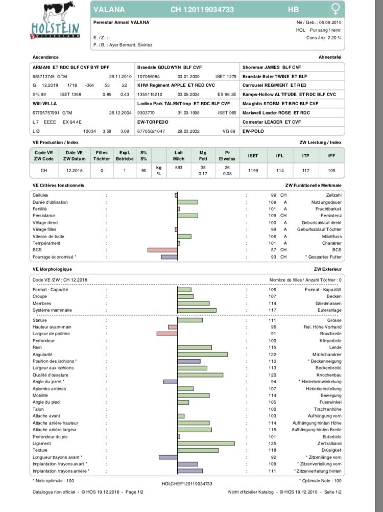 Superbe vache holstein toute fraîche de son deuxième veau. Elle a produit 9210kg de lait en première lactation et a été classifiée g+84 ainsi que vg87 dans les membres. Cette belle Armani ne sort pas de nulle part car c’est la fille de la fameuse Wilt-Vella ex94 4E (ex94 dans tous les postes)et a produit 88712kg de lait en 7 lactations. Sa grand-mère EW-Torpedo est classifiée vg89 en première lactation. En photo professionnelle c’est Wilt-vella. Wunderschöne Holstein-Kuh, ganz frisch in zweiter Lakt. Hat in erster Lakt. 9210 kg produziert, und wurde G+84 notiert- (Beine : VG87). Diese hübsche ARMANI ist eine Tochter der berühmten Wilt-VELLA EX94 4E (EX94 in allen Kriterien !), die 88'712 kg in 7 Laktationen produzierte. Die Grossmutter, EW-TORPEDO wurde VG89 in erster Laktation !! Als profi-Bild steht die Wilt-VELLA.