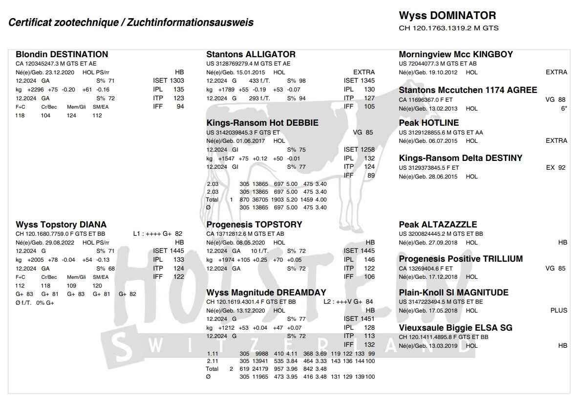 Ein sehr schöner Stier, mit sehr guten Zahlen. Er ist überall sehr ausgeglichen, und bringt sehr viel Milch mit sich. IPL 134 (Milch 2'205kg) IFF 117 ITP 118 Die Mutter steht noch in der ersten Laktation, hat aber in 284 Tagen bereits 12'000kg Milch produziert. Sein Onkel steht bei Swissgenetics zur Verfügung Wyss Topstory DIAZ