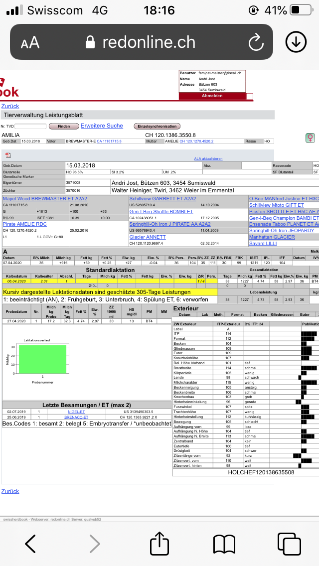 Frischgekalbte,Typstarke, junge, robuste und schwere Holstein Kuh. Amilia hat super Zuchtwerte: Milch +916 Fett + 0.24 Eiweiss -0.04 und Zuchtwert Zellzahl 111. Sie hat am Montag ihre 1.Wägung mit 32.3kg Milch mit 4.74% Fett, 2.97% Eiweiss und einer top Zellzahl von nur 30. Die Kuh hat schon einen Brustumfang von 218cm(821kg mit Messband). Sie ist ruhig und halftergewohnt. Aufzucht im Laufstall mit Silo. Jetzt im Anbindestall und Silofrei. Vache Holstein de type fort, jeune, robuste et lourde, au tout début de sa première lactation. Amilia a de super valeurs d'élevage: lait: +916; matière grasse: + 0,24; protéine: -0,04; et nombre de cellules en valeur d'élevage 111. Lundi, elle a eu son premier pesage avec 32,3 kg de lait avec 4,74% de matières grasses, 2,97% de protéines et un nombre de cellules supérieur à seulement 30. La vache a déjà un tour de poitrine de 218 cm (821 kg avec ruban à mesurer). Elle est calme et habituée au licol. Élevée dans un parc avec un silo. Maintenant dans l'étable et sans silo.