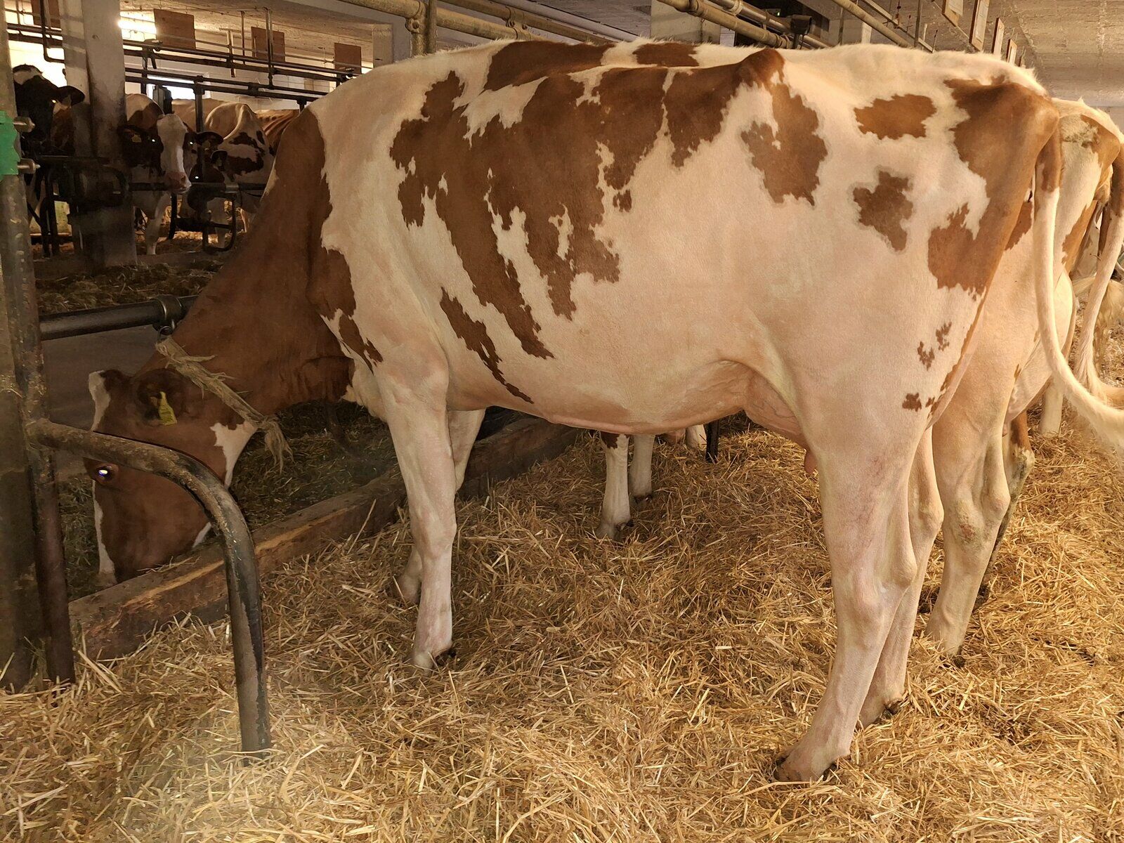 Jolie jeune vache RH, fille de Power avec un pis très bien attaché, 25 kg de lait, cellules 49, vitesse de traite idéale Malheureusement le cartier avant gauche s'est résorbé. Comme génisse elle est habituée aux logettes. Elle est ressaillie depuis le 27 mars. Sa mère a également des très bonnes teneurs
