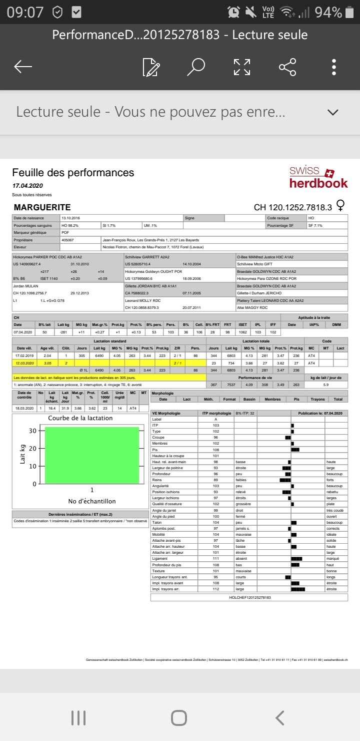 Jolie vache Ho 2 eme lactation. Habitué à l attache et en logette quand elle était genises Avec une très bonne mamelle une bonne vitesse de traite et un taux cellulaires très bon dernier contrôle 23 cellules. Exploitation En pâture intégrale l'ete et en zone defabrication de gruyere. Hübsche HO-Kuh in 2. Laktation. Gewohnt an Anbindestall und Logetten. Mit einem sehr guten Euter, einer guten Melkgeschwindigkeit und einer sehr guten Zellrate: letzten Milchtest= ZZ 23. Steht auf der Sommerweide und im Produktionsgebiet (Gruyere).
