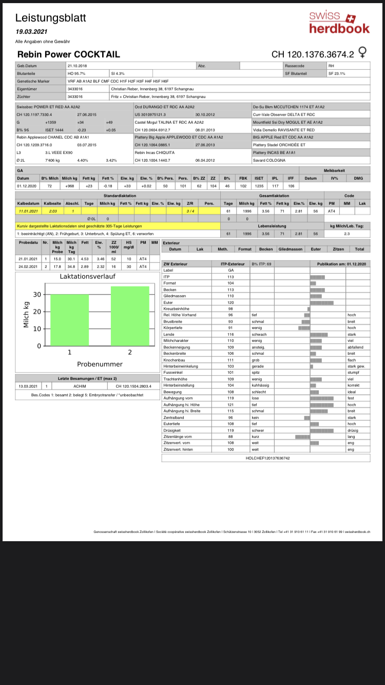 Leistungsstarke Red Holstein Zucht+ Nutzkuh. Sehr ruhiger Charakter, Milchfluss ideal, und Schalmtest i.O. Cocktail stammt aus einer tiefen Kuhfamilie, bei den folgenden 6 Generationen erhielten 4 Kühe die Beurteilung von EX 90 oder mehr! Dazu eine Kuh mit 89 VG( 92 Euter) und eine mit 84G+ in der 1.Laktation. Une vache Red Holstein alliant la productivité à une valeur d'élevage certaine. Caractère très calme, débit de lait idéal, et test de Schalm ok. Cocktail vient d'une famille de vaches profondes, dans les 6 générations suivantes 4 vaches ont obtenu l'évaluation de EX 90 ou plus ! En outre, une vache avec 89 VG (92 pis) et une avec 84G+ dans la 1ère lactation.