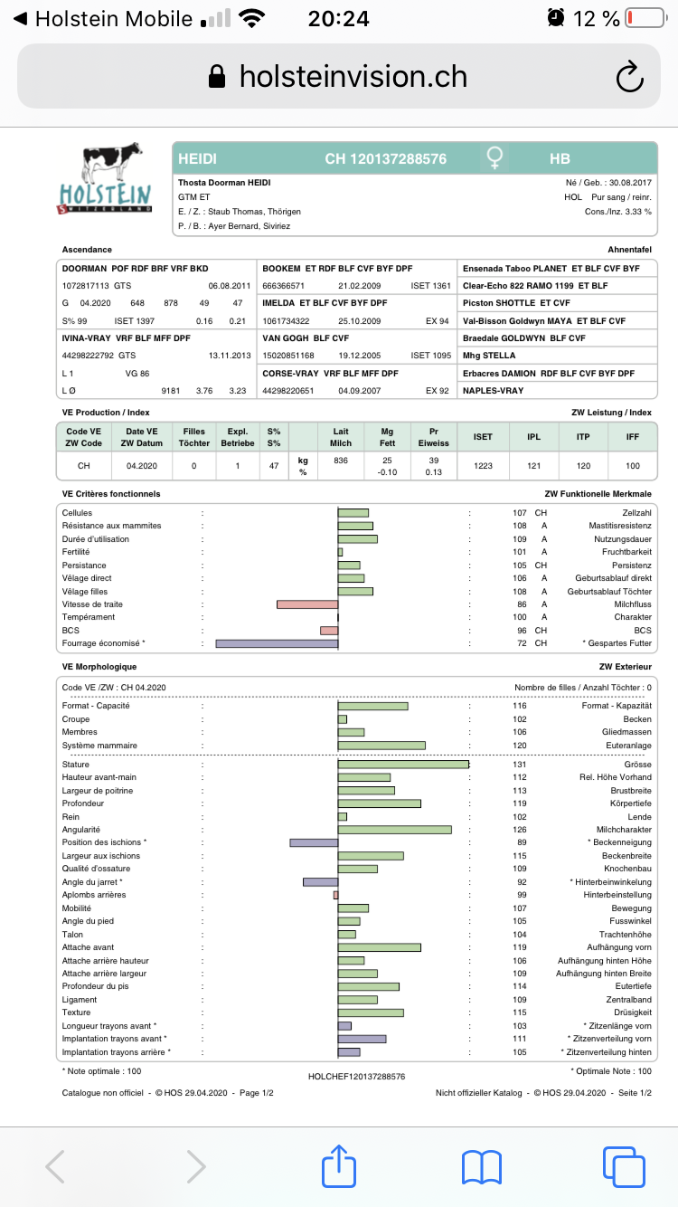 Superbe vache du taureau DOORMAN très élégante. Vitesse de traite idéale. Heidi a comme mère IVINA-VRAY VG86 en première lactation et comme grand-mère CORSE-VRAY EX92. Elle a un super pis avec une très bonne texture. Vache très calme. Hervorragende, sehr elegante DOORMAN-Tochter. Ideale Melkgeschwindigkeit. Heidi hat IVINA-VRAY VG86 in der ersten Laktation,als Mutter, und CORSE-VRAY EX92 als Großmutter. Sie hat ein super Euter mit einer sehr guten Textur. Sehr ruhige Kuh.