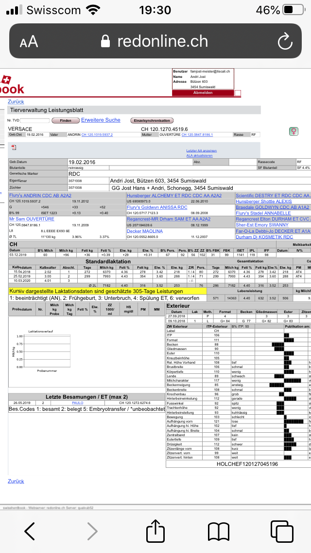 Kuh mit guter Fruchtbarkeit und sehr guter Abstammung. Mutter EX93 6E und im Durchschnitt von 7 Laktationen über 11‘000kg Milch. Die Kuh hat am 10.3.2020 frisch gekalbt und gibt zur Zeit 35kg Milch, jedoch drückt die Kuh vor dem Melken Milch aus hat aber trotzdem immer sehr tiefe Zellzahlen! Boxenlaufstall während Aufzucht. Vache avec de bonnes teneurs, une très bonne fécondité, et une très bonne ascendance. Sa mère EX93 6E a une moyenne de 11'000 kg sur 7 lactations. La vache est fraîche vêlée le 10 mars 2020 et produit actuellement 35 kg par jour. Il faut préciser que la vache perd du lait avant la traite, mais que malgré cela elle a toujours un nombre de cellules très bas ! Elle a été en boxes de stabulation pendant son jeune âge.